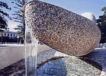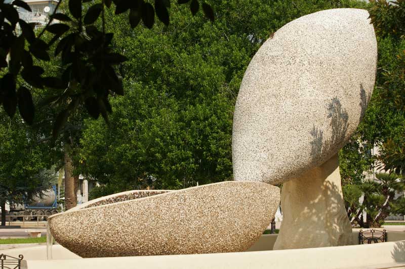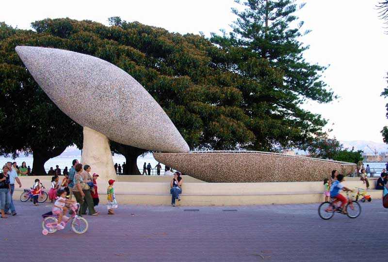 La nuova fontana della “Passeggiata a Mare” (collocata laddove c’era la vecchia vasca abbandonata) è stata progettata da tempo per tutt’altra collocazione dall’artista messinese Ranieri Wanderlingh e finalmente realizzata. Si tratta di Bios un’opera le cui dimensioni non passano inosservate (18 metri di lunghezza e sei di altezza), sebbene il suo sviluppo prevalentemente orizzontale, piuttosto che verticale, assecondi lo sviluppo anch’esso orizzontale del luogo che la ospita, della vegetazione presente ed, ovviamente, del mare alle spalle (o di fronte, a seconda della posizione da cui la si guarda), connotandola come un luogo dove lo sguardo possa posarsi oppure trascorrere oltre, alla stessa maniera in cui i frequentatori della “passeggiata” sono liberi di passarvi accanto o di sostare sui sedili ai margini dell’opera/fontana.
