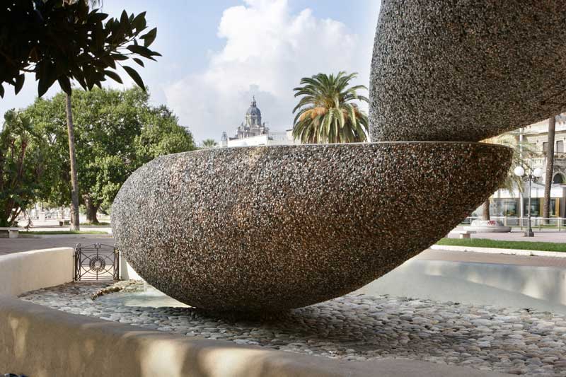 Nel recinto quattro elementi: la base, il fuso convesso in posizione obliqua, il fuso concavo in posizione orizzontale e la vasca ad esso sottostante a forma di goccia, che raccoglie l’acqua e la rimanda nella base in un circuito chiuso.