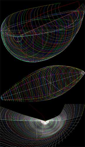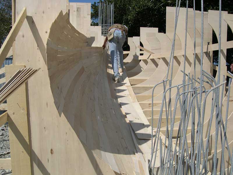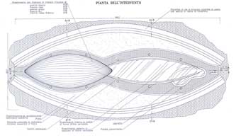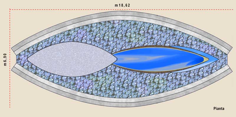 Con interpolazioni successive effettuate ogni 15 cm. sulla lunghezza totale di 9 metri dello sviluppo della vasca, ha individuato esattamente il volume da realizzare tracciando 63 sezioni che sono state trasferite su carta in vera grandezza. Tutti i disegni sono stati riportati su supporti rigidi e su questi si sono materializzati, con riscontri fissati ogni 5 centimetri, i tracciati reali per le armature in acciaio disposte sulle due facce, interna ed esterna, della parete in calcestruzzo.