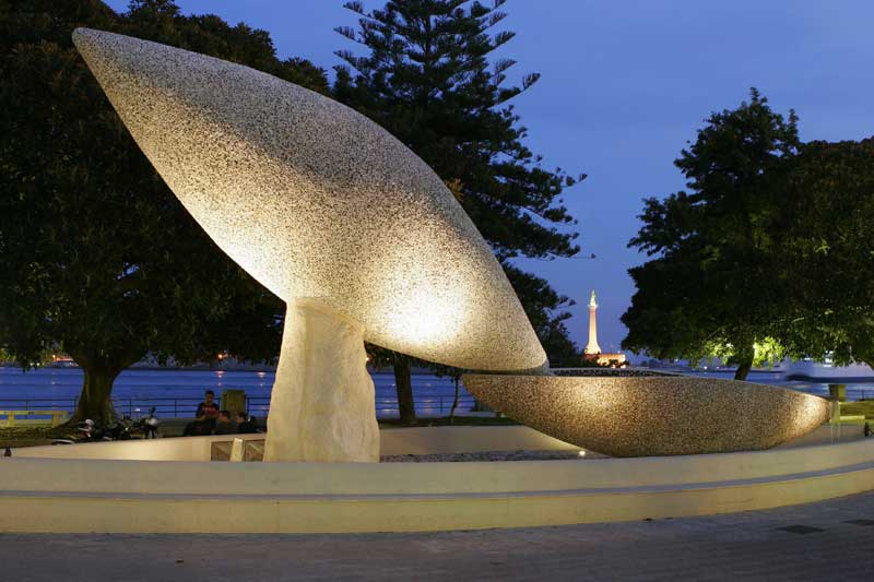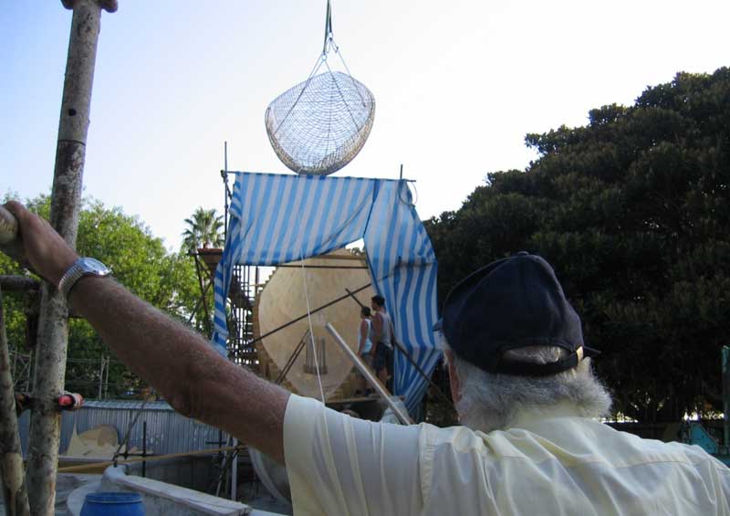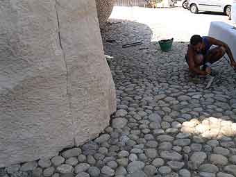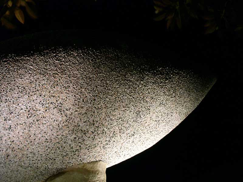 Infine si è proceduto alla pavimentazione dell’area di base con ciottoli in pietra, al completamento dell’ impianto idrico ed elettrico con l’illuminazione a pavimento ed all’interno della vasca ed al rivestimento del pilastro di sostegno dello sferoide realizzato con 4 blocchi di pietra leccese appositamente scolpiti in cava su direzione dell’artista.