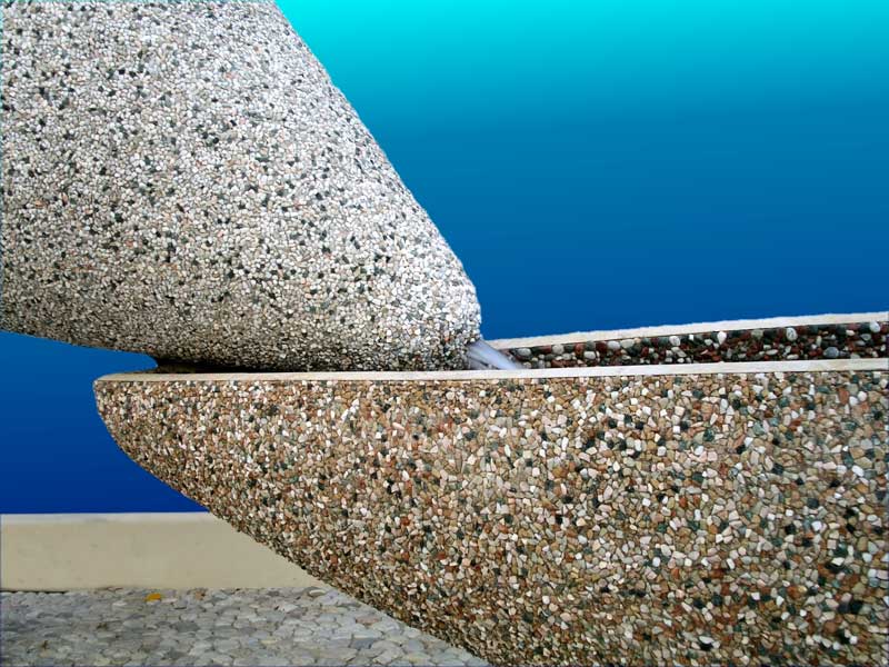 Successivamente si è proceduto alla impermeabilizzazione ed al rivestimento interno della vasca con l’uso di ciottoli scelti di pietra di fiume. Dopo attenta rifinitura delle superfici, per il rivestimento esterno della vasca e dello sferoide si è proceduto alla posa del mosaico costituito da grani di marmi e graniti di 10 tipologie, posati singolarmente, con una granulometria compresa tra cm 1,5 e 2,5, secondo le rispettive percentuali definite dall’artista per ottenere l’effetto cromatico finale.