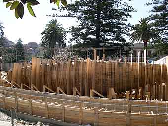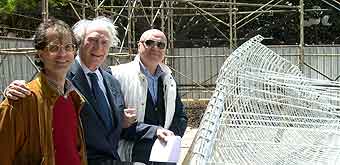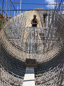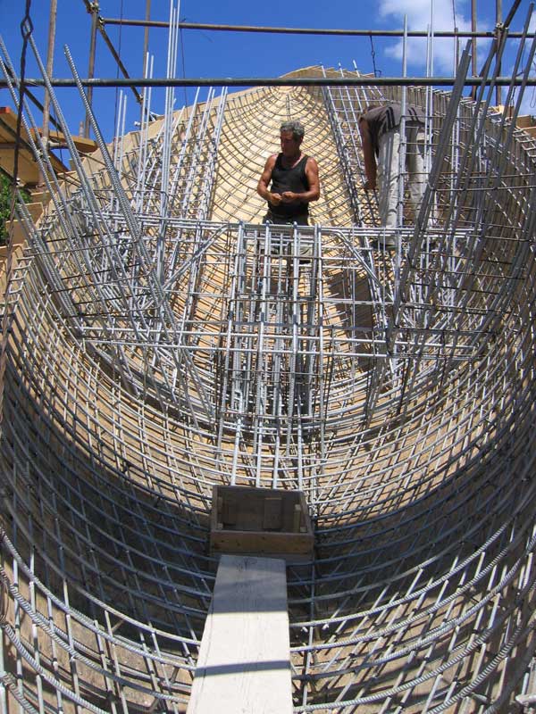 Con le coordinate spaziali di ognuna delle 63 sezioni si è eseguito il montaggio, a partire dalla sezione equatoriale, sia per il blocco nord che per il blocco sud e si è completata l’armatura saldando sulle due facce principali i tondini d’acciaio della ripartizione longitudinale, realizzando così una doppia maglia spaziale di tondini d’acciaio con 15x15 centimetri di lato.