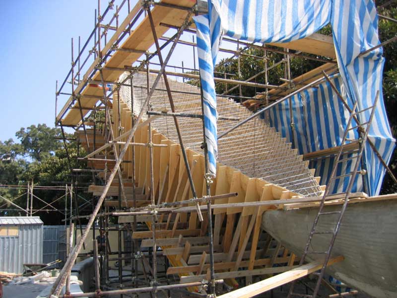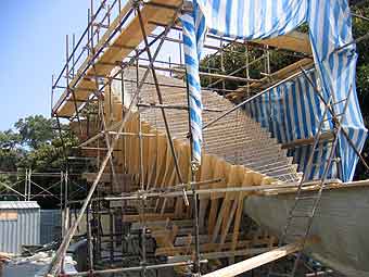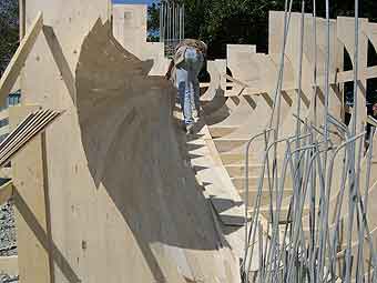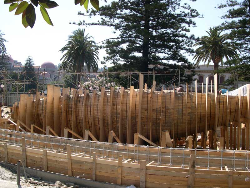 Frattanto in cantiere sono state ultimate le fondazioni e predisposte le canalizzazioni per gli impianti, si sono sagomate le sezioni della carpenteria per realizzare il fasciame in legno per i getti, come disegnate al computer , si è poi iniziato il montaggio della carpenteria di sostegno e del fasciame in legno e si sono inserite le armature preassemblate e zincate nelle carpenterie eseguite.