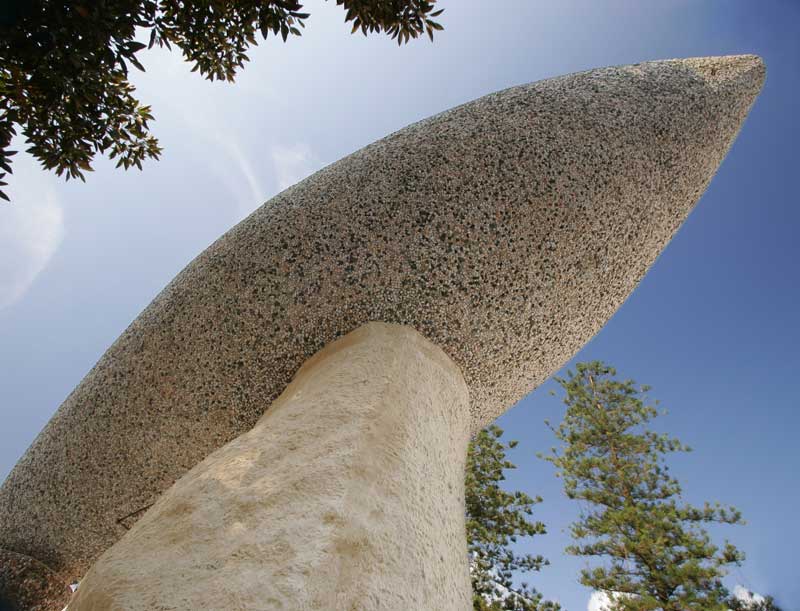 La base rocciosa e grezza, quasi a significare la materia primigenia, il caos, il non conoscibile, perché non è dato vedere nel suo interno all’occhio dell’uomo. Essa è costituita da pietra arenaria di colore bianco, proveniente dalle cave del Salento. In questa si possono osservare ad occhio nudo conchiglie marine ed altri residui organici della vita sottomarina, caratteristica di tutte le terre emerse.