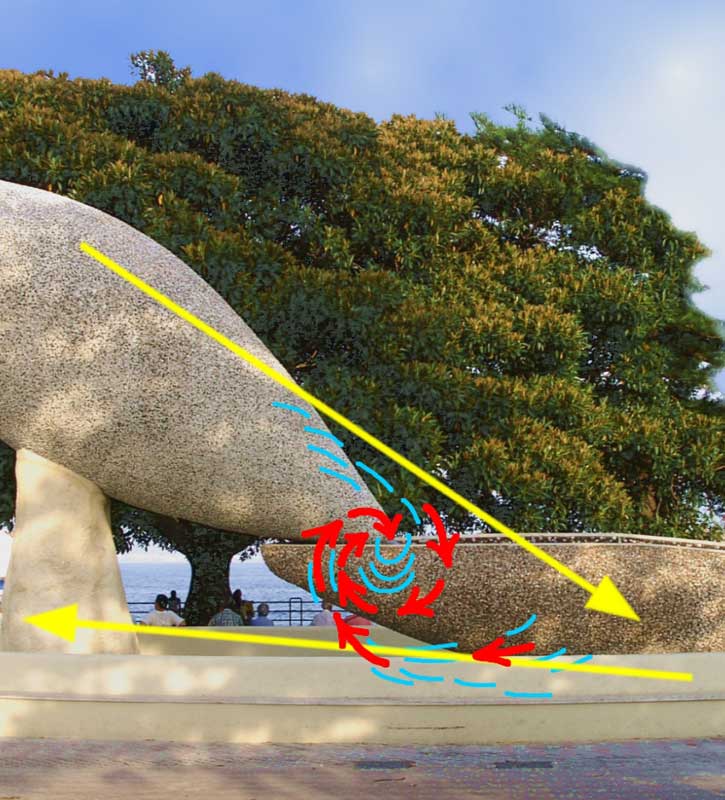 L’energia “dura” (nella tradizione balinese il concetto è espresso dalla parola keras) è contenuta tra due energie di tipo opposto (manis) e in qualche modo ne devia le direzioni. Ne risulta un’energia che procede asintoticamente rispetto alla terra: non è anche questo un movimento di scivolamento?