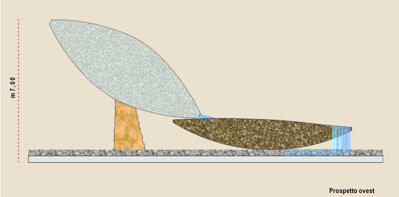 Il contenuto a sua volta trasborda attraverso una cascata che disegna fuori dalla cavità un meraviglioso velo d’acqua che andrà a riempire una piccola conca scavata sul terreno. Quest’ultima segue come un’orma la forma degli elementi originari ma semplificandoli al minimo ( minimo spessore ; riduzione delle misure; dimezzamento ulteriore del modulo: che risulta mancante di una delle punte; ammorbidimento degli spigoli: riduzione a goccia). Da qui l’acqua ritornerà attraverso un canale nascosto al suo punto di partenza (sistema a circuito chiuso).