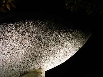 Da una prima visione dell’opera questo elemento salta immediatamente agli occhi. L’analisi lo conferma. Ho parlato in primo luogo dell’appoggio del primo elemento (che chiamo per comodità ellissoide) sulla base. E’ sorprendente la leggerezza di questo appoggio, nient’affatto coerente con la pesantezza delle masse. Ciò implica due immediate considerazioni: la percezione del movimento è la risultante di una infinità di possibilità che l’occhio di chi guarda (in maniera del tutto inconsapevole) riceve a causa della posizione squilibrata dell’ellissoide: quello che prima ho chiamato movimento di scivolamento verso il basso; un rimbalzo verso l’alto; il curvarsi della materia (simbolica anfora) per permettere la fuoriuscita dell’acqua; … ma è anche il risultato di una visione che pone nettamente in contrasto (costruendo un equilibrio spiazzante) i due concetti di peso e di leggerezza. Il concetto di peso, a mio avviso, sembrerebbe in questo caso rimandare all’Istinto di Morte (ampiamente concettualizzato da Freud: tentativo di ritorno allo stato di quiete), mentre la leggerezza sarebbe il riflesso contrario, la resistenza della materia, il piacere dell’azione, in quanto non esiste leggerezza senza spinta attiva verso l’alto (conseguenza del Principio di Piacere che porterebbe ad un rinnovarsi del piacere di vivere e non al piacere della morte).