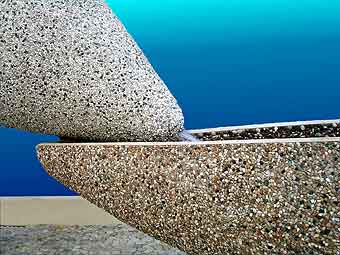 Sapiente è la scelta dei materiali naturali: frammenti di granito per la superficie delle due forme principali che oltre ad indicarne la complementarità (il pieno tende alla colorazione azzurra mentre il cavo al colore rosso) ne assicurano la brillantezza.