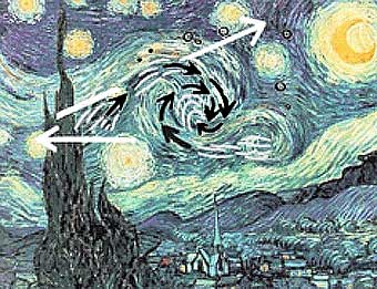 Il disegno precedente, ruotato, sovrapposto al quadro notte con cielo stellato di Vincent Van Gog.