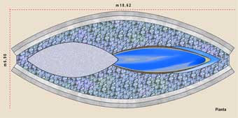 Il semifuso concavo, in posizione orizzontale di metri 8 di lunghezza e 2 di larghezza, è rivestito all’interno da pietre di fiume di colore marrone e grigio ed all’esterno da grani di colore bruno-rosato.